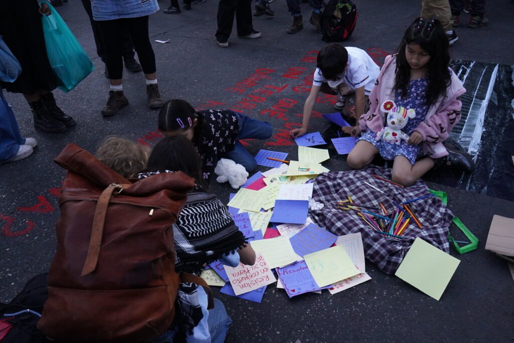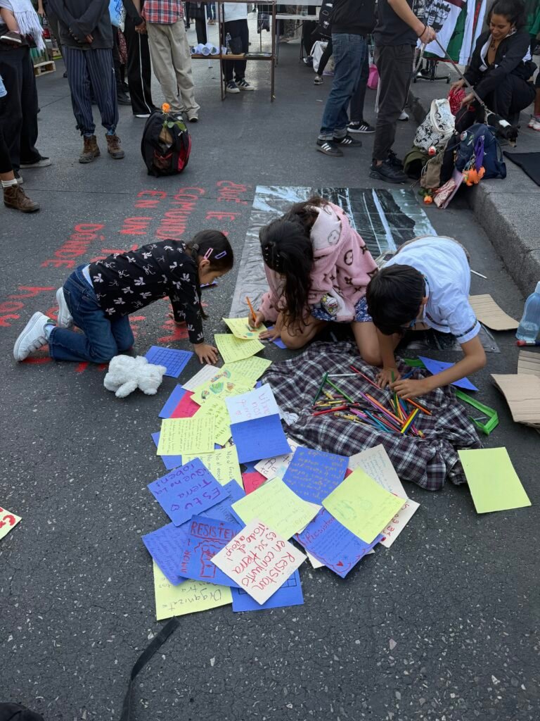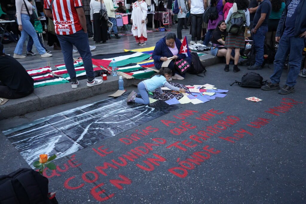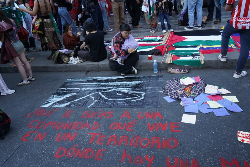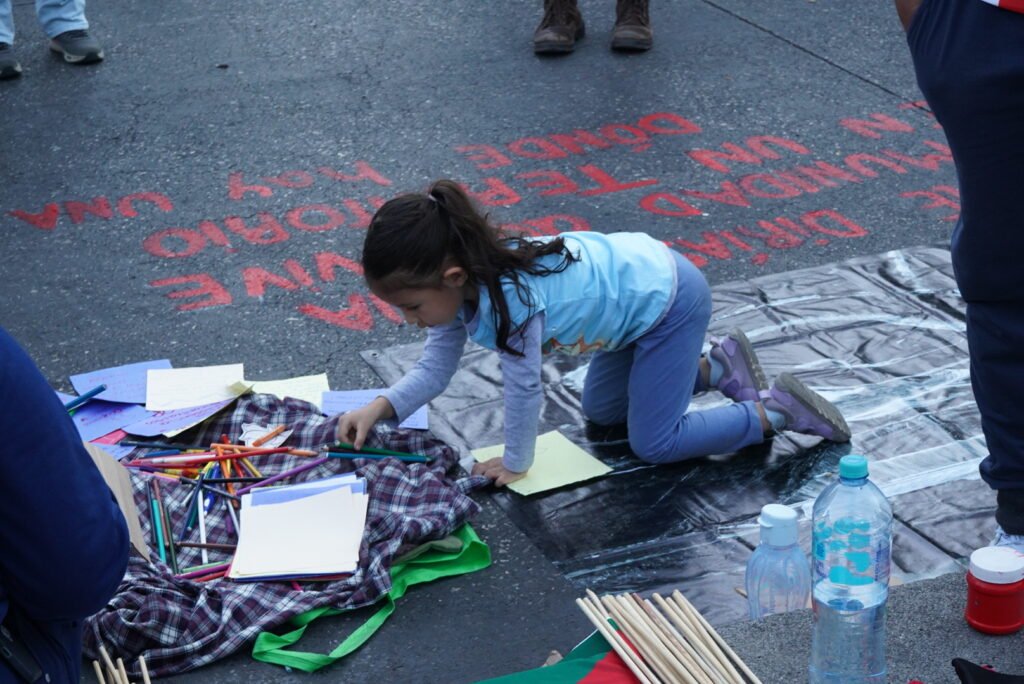 En el marco del evento “Un rumor se levanta”, la artista Sabina realizó una acción artística-cultural junto con Sueña Dignidad, dónde se pintó en el suelo la pregunta, ¿Qué le dirías a una comunidad que vive en un territorio dónde hay una mina?, junto a la fotografía área de una mina que documentamos en el sur del país para que los asistentes pudieran mandar palabras de aliento, dejando el mensaje de que en todos nuestros territorios la minería atenta contra la vida, los mensajes recabados serán entregados a las comunidades en resistencia.