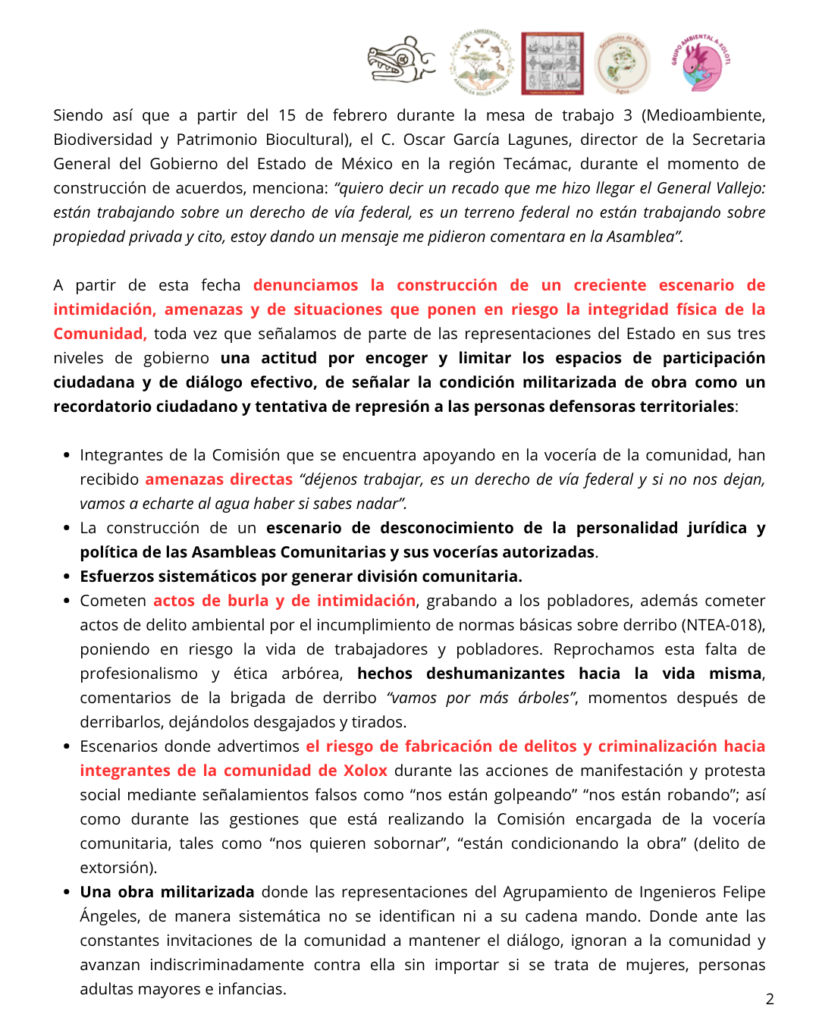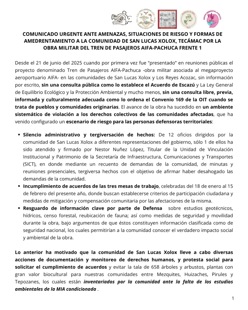 Estos hechos se suman a un contexto de amenazas directas —incluyendo la frase «vamos a echarte al agua haber si sabes nadar»—, actos de burla e intimidación, y una obra militarizada que avanza sin identificar cadena de mando ni responder a invitaciones de diálogo. Responsabilizamos al General Gustavo Vallejo, al C. Oscar García Lagunes, a Néstor Núñez López de la SICT, y a la Presidenta Claudia Sheinbaum de garantizar la integridad de las personas defensoras territoriales, y llamamos a organismos de derechos humanos y medios de comunicación a pronunciarse y vigilar un ambiente respetuoso de los derechos humanos durante la construcción de esta obra, refrendando que la comunidad de San Lucas Xolox ha priorizado el diálogo y se ha conducido en todo momento en el marco de la ley y los canales institucionales.