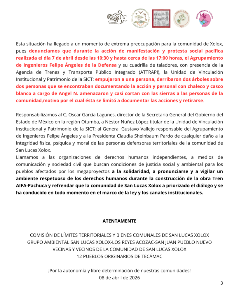 Sueña Dignidad se solidariza con la comunidad de San Lucas Xolox, Tecámac, ante las amenazas con motosierras ocurridas el 7 de abril de 2026 durante una manifestación pacífica contra la obra del Tren de Pasajeros AIFA-Pachuca. Según el comunicado de la Comisión de Límites Territoriales y Bienes Comunales, integrantes del Agrupamiento de Ingenieros Felipe Ángeles de la Defensa, acompañados de personal de ATTRAPI y la SICT, empujaron a una persona, derribaron dos árboles sobre dos personas que documentaban la acción, y un trabajador con chaleco y casco blanco a cargo de Ángel N. amenazó y casi cortó con las sierras a las personas de la comunidad, lo que motivó que ésta se limitara a documentar las acciones y retirarse.